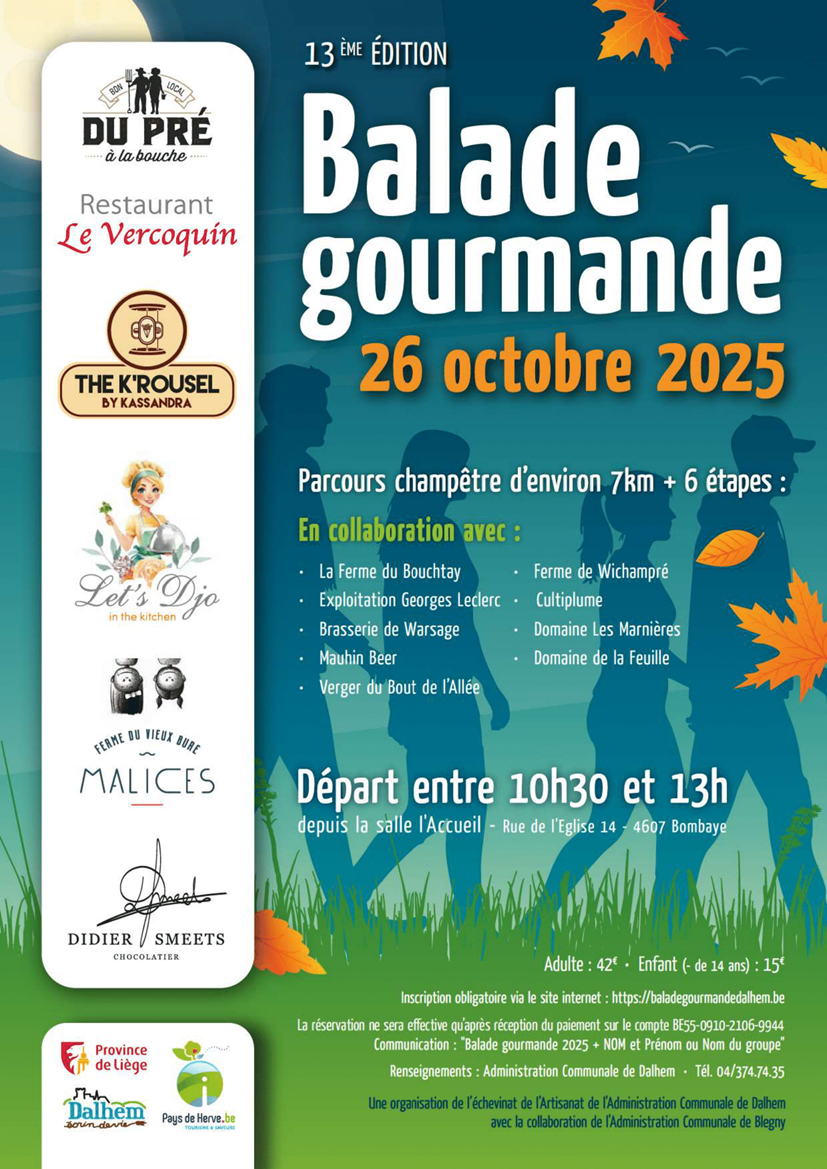 Partez à la découverte des saveurs locales lors d'une balade de 7 kilomètres à travers les paysages verdoyants de Dalhem. Chaque étape vous révélera les trésors culinaires de nos partenaires locaux.